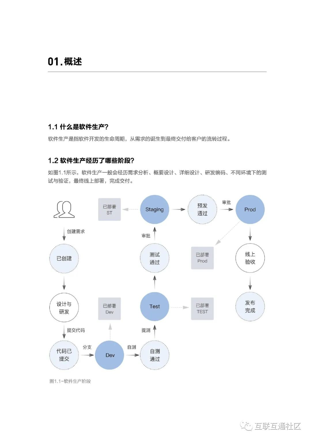 软件生产一般会经历需求分析、概要设计、详细设计、研发编码、不同环境下的测试与验证,最终线上部署,完成交付。