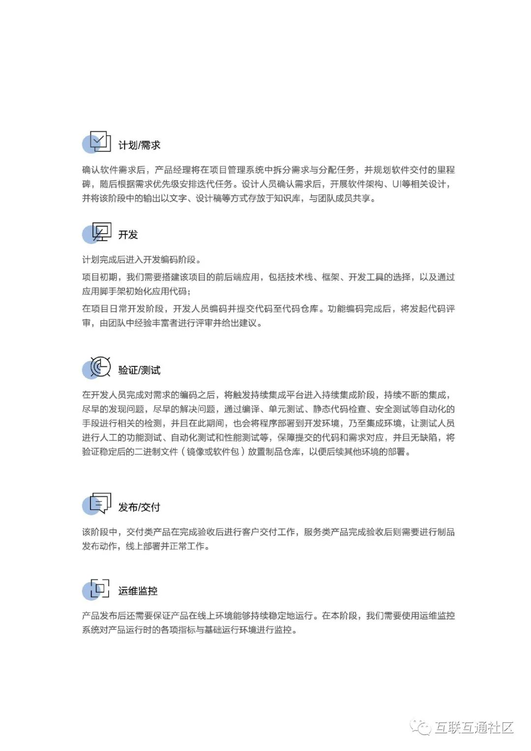 通常,我们会将软件生产按软件开发的生命周期进程划分为以下几个阶段,分别为:计划/需求阶段、开发阶段、验证/测试阶段、发布交付阶段,以及最后的运维/监控阶段。