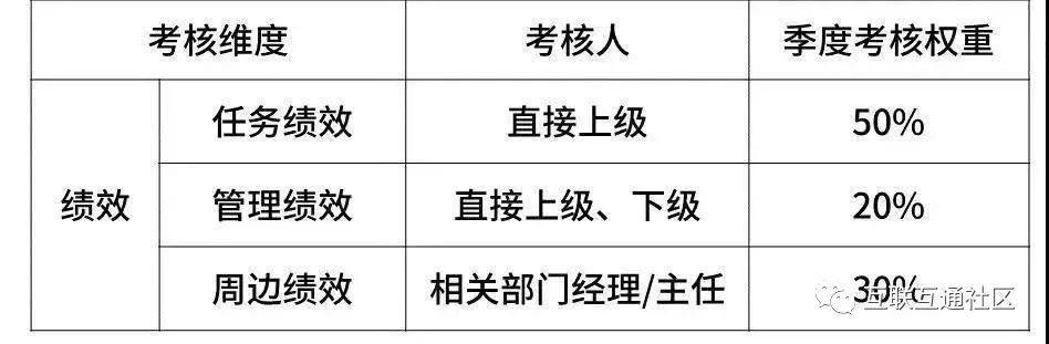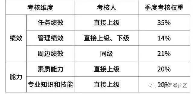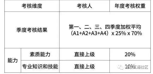 1、季度考核:中层和一般员工都要通过季度考核,根据不同的对象,考核维度与权重也不同。