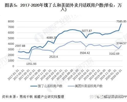 2017-2020年3月,饿了么月活跃用户数大于美团外卖。2020年初疫情影响下,两平台活跃用户数均有所减少,2020年3月起恢复增长,截至2020年3月31日,美团外卖月活跃用户数为3744.57万人,饿了么月活跃用户数为7585.85万人。