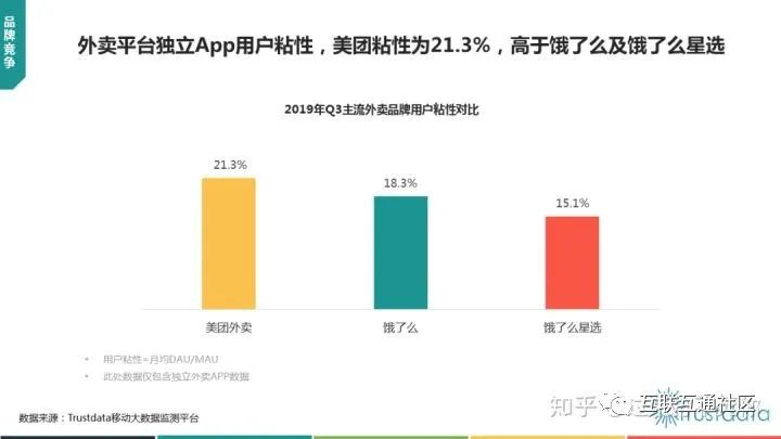 此外,在用户粘性上,美团外卖用户粘性21.3%,饿了么18.3%,美团高出饿了么;