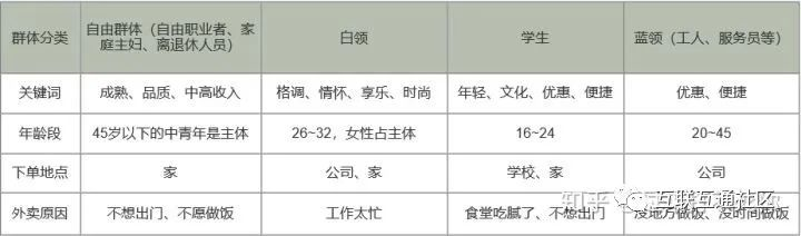 小结:用户主要有自由群体、白领、学生、蓝领四大群体,其中自由群体占多数,年龄层以35岁以下中青年为主;用户点外卖最主要原因是便利(如不想做饭、不想出门、工作太忙)。