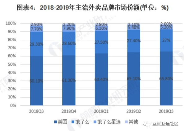 美团市占率大于饿了么,活跃用户数少于饿了么,2018-2019年,主流外卖品牌为美团和饿了么,美团市场份额大于饿了么与饿了么星选的总和。2019年第三季度,美团外卖交易额占比稳中有升,达到65.8%。