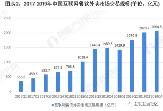 2017-2019年,我国互联网餐饮外卖交易规模逐渐扩大,2019全年超7274亿元。互联网对餐饮行业的快速渗透,从早期的团购,到外卖用户群体和交易规模的剧增,以及线上餐饮信息服务的逐渐发展,在线餐饮以及用户消费数据都得到了爆炸式增长。