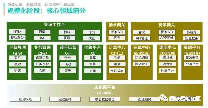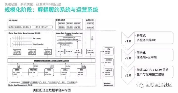 除了履约、运营两个系统的架构设计外,架构设计层面还有一个非常关键的问题,即履约、运营系统的边界与职责如何划分的问题。个人理解这个问题可能是O2O类业务在规模化阶段最关键的架构设计问题,如果不能有效解决将为系统的可用性、扩展性埋下巨大隐患。履约、运营两个方向的业务需求和技术职责有较大差异,且多数数据的生产都在运营系统,最核心最关键的应用在履约系统。虽然各自的领域职责是清晰的,但对于具体的需求边界上不见得简单明了。对此,我们借鉴了MDM思路,提出了主数据平台(图下侧)的概念,重点解决履约系统与运营系统的合作与边界问题。