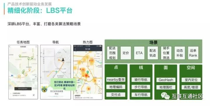 LBS平台早在配送业务的起步阶段就开始实施,随着算法场景的不断发展,LBS不断深化点线面空间能力,为配送调度、时间预估、定价等业务场景提供支撑,打造了任务地图、路径规划、语音导航、热力图等产品。