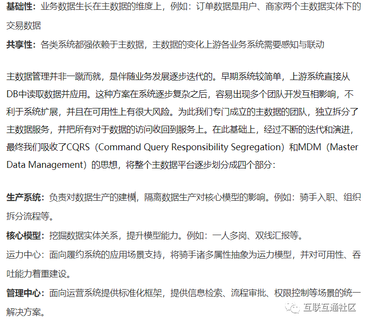 主数据是企业信息系统中最基础的业务单位数据,对于配送而言是组织、岗位、人员、商家、用户、城市等数据。与之对应的是业务数据,例如:订单、考勤、薪资等。主数据有两个最关键的特征: