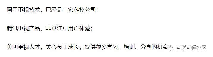 最后,总结一下三家大厂,阿里和腾讯是老牌互联网大厂,美团是年轻互联网大厂。