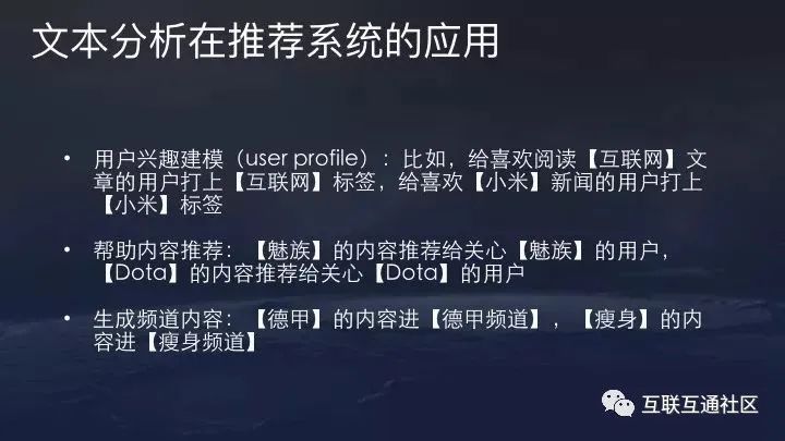内容分析包括文本分析,图片分析和视频分析。头条一开始主要做资讯,今天我们主要讲一下文本分析。文本分析在推荐系统中一个很重要的作用是用户兴趣建模。没有内容及文本标签,无法得到用户兴趣标签。举个例子,只有知道文章标签是互联网,用户看了互联网标签的文章,才能知道用户有互联网标签,其他关键词也一样。