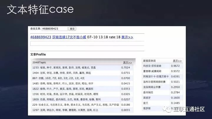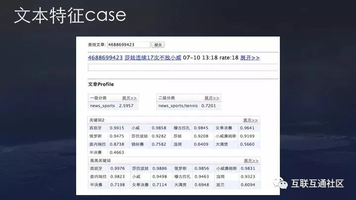 上图是今日头条的一个实际文本case。可以看到,这篇文章有分类、关键词、topic、实体词等文本特征。当然不是没有文本特征,推荐系统就不能工作,推荐系统最早期应用在Amazon,甚至沃尔玛时代就有,包括Netfilx做视频推荐也没有文本特征直接协同过滤推荐。但对资讯类产品而言,大部分是消费当天内容,没有文本特征新内容冷启动非常困难,协同类特征无法解决文章冷启动问题。