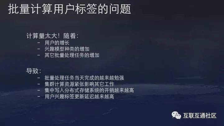 但问题在于,随着用户高速增长,兴趣模型种类和其他批量处理任务都在增加,涉及到的计算量太大。2014年,批量处理任务几百万用户标签更新的Hadoop任务,当天完成已经开始勉强。集群计算资源紧张很容易影响其它工作,集中写入分布式存储系统的压力也开始增大,并且用户兴趣标签更新延迟越来越高。