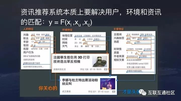推荐系统,如果用形式化的方式去描述实际上是拟合一个用户对内容满意度的函数,这个函数需要输入三个维度的变量。第一个维度是内容。头条现在已经是一个综合内容平台,图文、视频、UGC小视频、问答、微头条,每种内容有很多自己的特征,需要考虑怎样提取不同内容类型的特征做好推荐。第二个维度是用户特征。包括各种兴趣标签,职业、年龄、性别等,还有很多模型刻划出的隐式用户兴趣等。第三个维度是环境特征。这是移动互联网时代推荐的特点,用户随时随地移动,在工作场合、通勤、旅游等不同的场景,信息偏好有所偏移。结合三方面的维度,模型会给出一个预估,即推测推荐内容在这一场景下对这一用户是否合适。