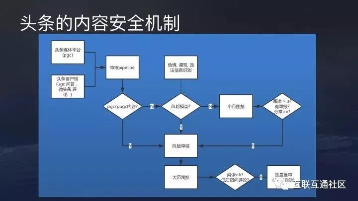 现在,今日头条的内容主要来源于两部分,一是具有成熟内容生产能力的PGC平台,一是UGC用户内容,如问答、用户评论、微头条。这两部分内容需要通过统一的审核机制。如果是数量相对少的PGC内容,会直接进行风险审核,没有问题会大范围推荐。UGC内容需要经过一个风险模型的过滤,有问题的会进入二次风险审核。审核通过后,内容会被真正进行推荐。这时如果收到一定量以上的评论或者举报负向反馈,还会再回到复审环节,有问题直接下架。整个机制相对而言比较健全,作为行业领先者,在内容安全上,今日头条一直用最高的标准要求自己。