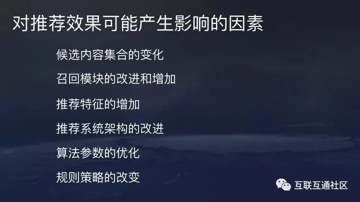事实上,很多因素都会影响推荐效果。比如侯选集合变化,召回模块的改进或增加,推荐特征的增加,模型架构的改进在,算法参数的优化等等,不一一举例。评估的意义就在于,很多优化最终可能是负向效果,并不是优化上线后效果就会改进。