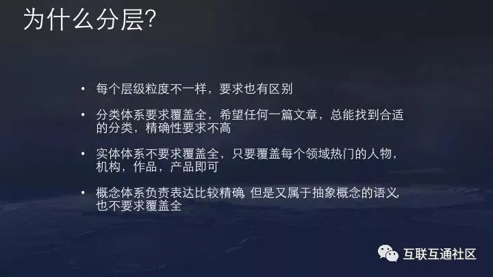 分类的目标是覆盖全面,希望每篇内容每段视频都有分类;而实体体系要求精准,相同名字或内容要能明确区分究竟指代哪一个人或物,但不用覆盖很全。概念体系则负责解决比较精确又属于抽象概念的语义。这是我们最初的分类,实践中发现分类和概念在技术上能互用,后来统一用了一套技术架构。