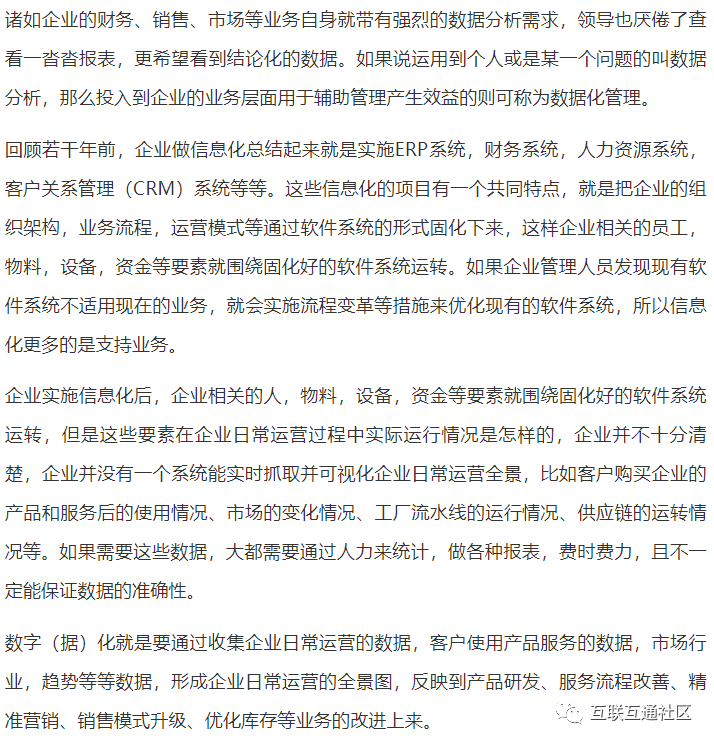 数字化转型是个和大数据一样,是个有点大有点虚的概念,映射到直接落地,相对接地气的概念就是数据化管理,也是当下很多企业正在实施的措施。