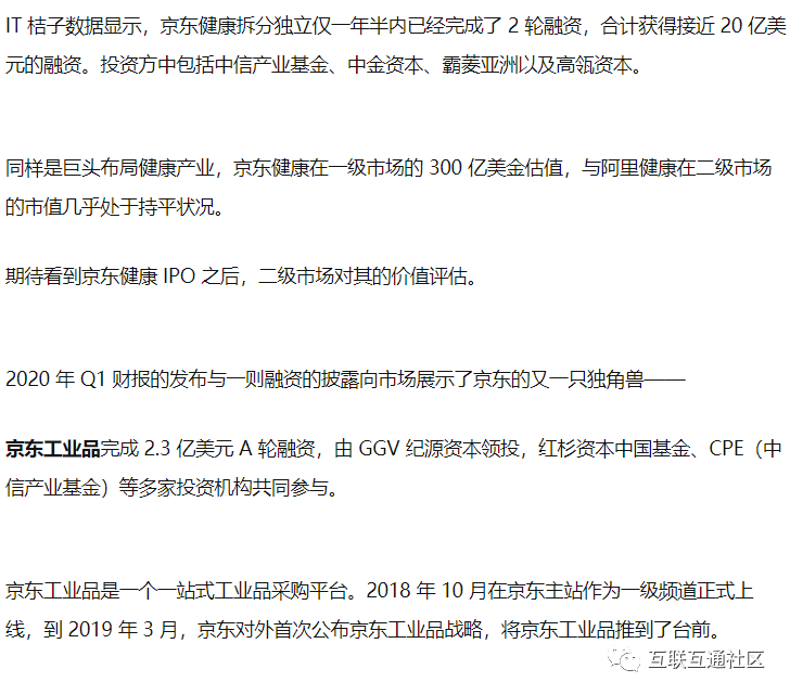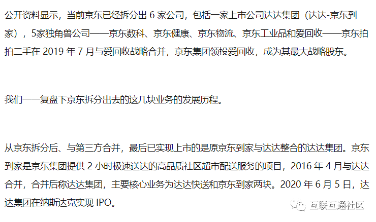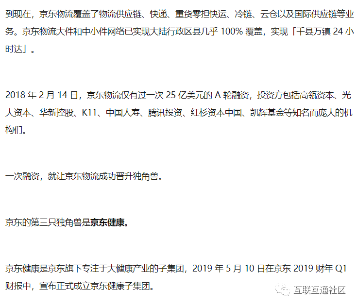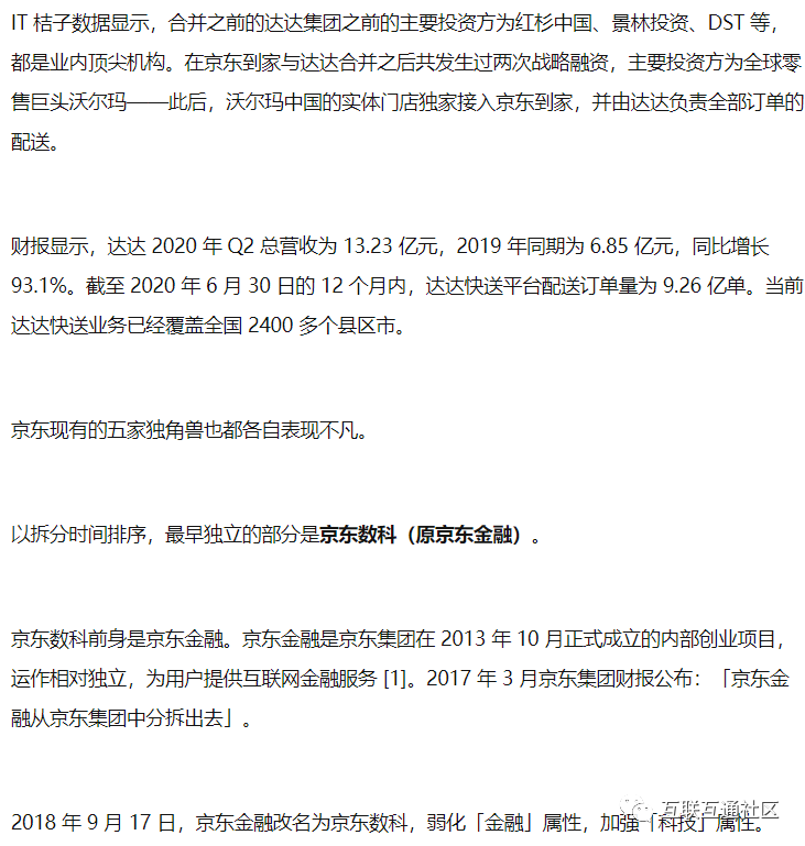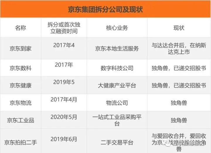 而除以上两家之外,还有「京东物流」、「爱回收」和「京东工业品」三家独角兽。如果再算上由京东到家和达达合并而成的、6 月已登陆纳斯达克的达达集团(达达-京东到家)——