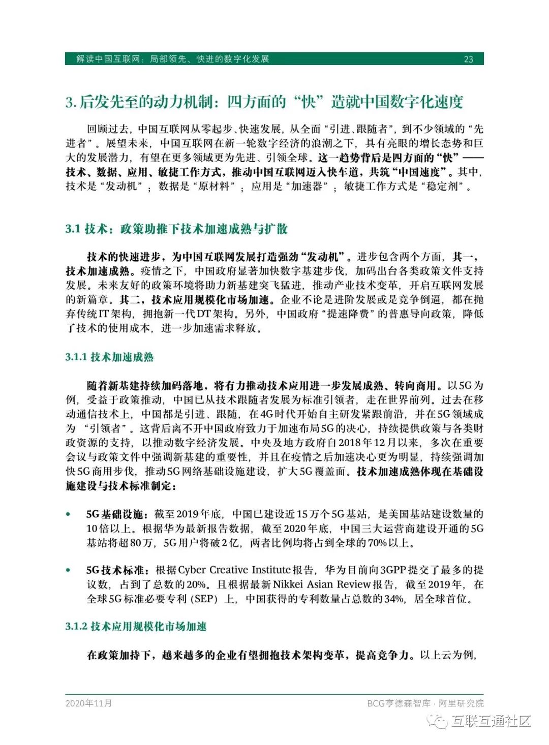 回顾过去,中国互联网从零起步、快速发展,从全面“引进、跟随者”,到不少领域的“先进者”。展望未来,中国互联网在新一轮数字经济的浪潮之下,具有亮眼的增长态势和巨 大的发展潜力,有望在更多领域更为先进、引领全球。这一趋势背后是四方面的“快”—— 技术、数据、应用、敏捷工作方式,推动中国互联网迈入快车道,共筑“中国速度”。其中, 技术是“发动机”;数据是“原材料”;应用是“加速器”;敏捷工作方式是“稳定剂”。