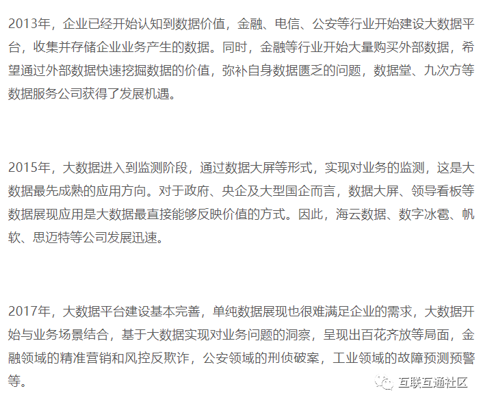 从2013年至今,大数据行业经历了四个发展阶段,代表了企业对大数据的认知和需求,也带动起一批批大数据公司。