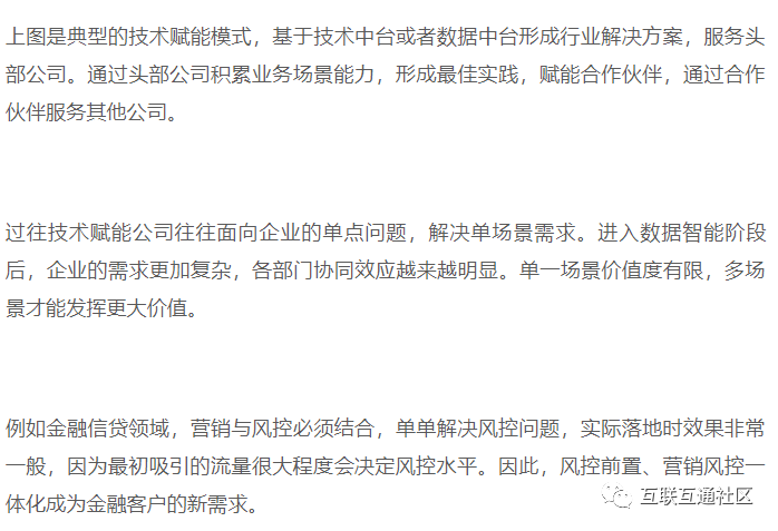 从技术赋能到合作分成,越贴近场景价值度越高。数据是兼具IT属性和业务属性,仅仅解决IT需求价值度远远低于业务需求,因为企业建设IT系统的目的是为了支持业务发展,企业数字化转型的目的也是为了支持业务快速发展,实现业务的精细化运营,对云计算、大数据、人工智能的投入都是为了这个目的。