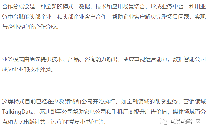 第三,具备运营能力。合作分成意味着数据智能公司要长期参与到业务过程中,具备业务运营能力,能够根据企业客户的需求,快速开发新产品及应用,不断迭代升级,满足企业的需求。