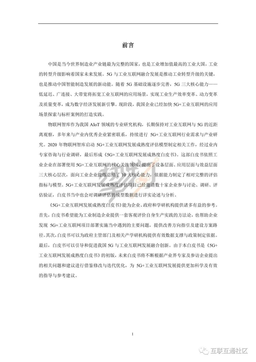 物联网智库作为我国 AIoT 领域的专业研究机构,长期保持对工业互联网与 5G 的近距离观察,多年来与产业内优秀企业紧密联系,持续进行 5G+工业互联网行业需求与产业研究。2020 年物联网智库启动 5G+工业互联网发展成熟度评估模型制定相关工作,经过业内专家咨询与行业调研,最后形成《5G+工业互联网发展成熟度白皮书》。