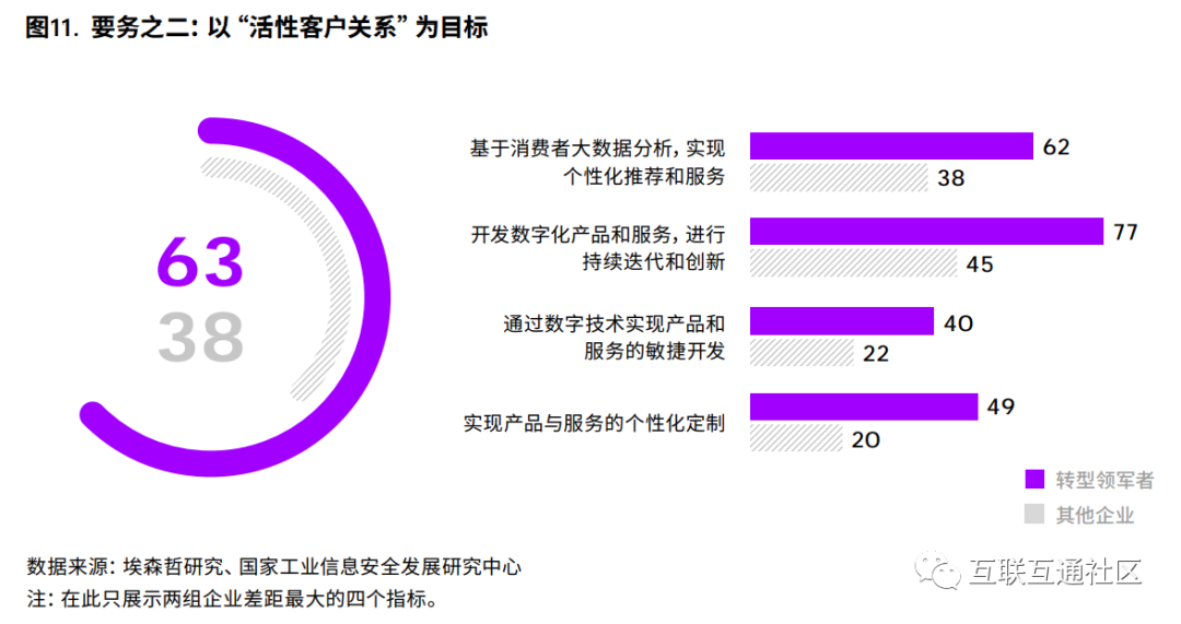 数字时代,企业客户、个人消费者的力量迅速 崛起,买卖双方的关系变得更为紧密而多变。企业 要获得竞争优势,就必须做出改变,要关注客户个 性化需求、打造活性客户关系。转型领军者已经意识到,随着客户期望的提 升,企业所提供的体验也必须随之提高。他们重视 基于消费者大数据分析实现个性化推荐和服务,并 基于这些客户数据开发数字化产品和服务,同时保持持续的迭代和创新。领军者也在努力实现产品与 服务的个性化定制(图11)