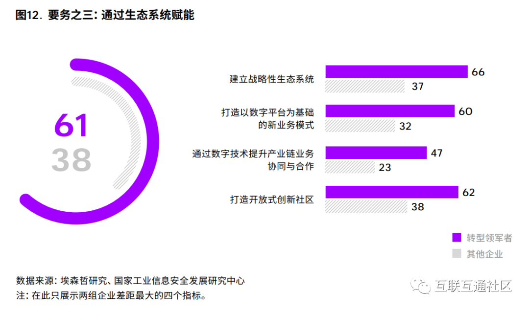 转型领军者在建立战略性生态系统、打造开 放式创新社区、打造以数字平台为基础的新业务模 式方面显著领先于其它企业。究其原因,转型领军 者能够将生态合作思维贯穿整个创新和转型过程 (图12)。