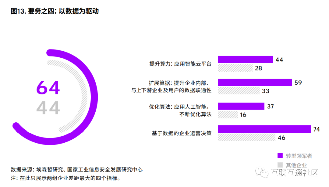 区别转型领军者与其他企业的关键指标包括 算力、算据和算法,即云计算为代表的数据计算能 力、数据质量和连通性所决定的算据、AI带动的优 化算法,以及基于数据的综合决策。转型领军者在 这几个关键指标的评估上遥遥领先(图13)。