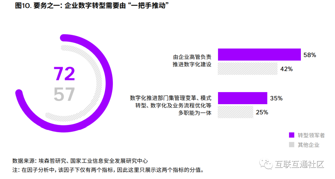 转型领军者非常重视高层领导在企业数字转 型中的作用,58%的被访领军者表示其数字化建 设由高管负责,而其他企业中只有42%做到了这一 点。而被访领军者中35%的企业对数字化推进部 门的定位不是局限于IT部门,而是集管理变革、模 式转型等多职能为一体的综合性部门,比其他企业 高出10个百分点(图10)。