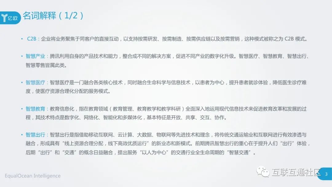 (3)行业解决方案——智慧产业,腾讯选择了医疗、教育、零售和出行四个行业进行“单点”突破, 促进行业全链条的数字化升级;