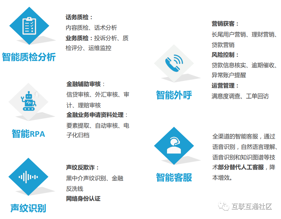 现阶段金融行业语音方案普遍采用结构性问答智能回复,特殊问题转人工的客服模式,一方面提升用工效率,另一方面方便数据整合处理。部署模式根据金融机构体量及需求分为公有云、私有云、混合云三种,并主要应用于外呼、身份认证、 质检以及客服场景。