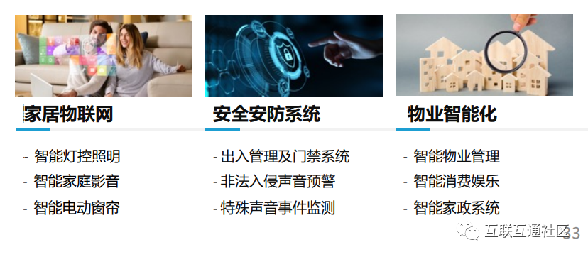 更安全的家居环境:智能家居落地需要完善的智能安防系统支持,它包括家庭整体安防系统和家居安 全预警系统,主要应用在物业智能家居系统的智能入园检测、出入管理、门禁系 统,停车场智能化管理,以及非法入侵声音预警、特殊声音事件监测、报警与紧急求助信号等场景。
