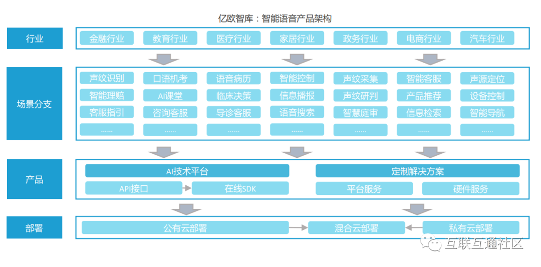 智能语音企业级市场主要产品模式分为AI开放平台技术输出和定制解决方案两种。AI技术平台提供基于公有云的SaaS服务,将应用软件统一部署在服务器。根据企业需求,提供API接口、或快速集成的在线智能语音SDK 。定制解决方案基于技术能力和行业理解,将设备和应用场景进一步融合。提供包含硬件服务、平台服务在内的混合云或私有云部署,相比技术平台输出,拥有更高的定制度。