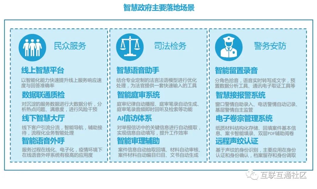 智慧政务解决方案以对话式AI能力和场景化大数据能力,定制化解决政务行业痛点。以“线下智慧大厅+线上智慧平台”的服务模式,搭建全渠道、全链路对话式客服AI,并在司法检务、基层社区、警务安防等场景个性化定制。由于政务行业信息敏感性较强,为保障数据安全,普遍以私有云或混合云部署模式为主。