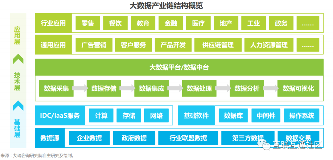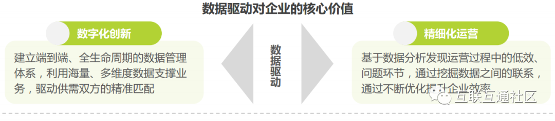 对于数据驱动型企业而言,拥有数据是前提条件,数据可以是来自企业自身的经营管理,也可以来自外部的如政府数据、 第三方数据等,而数据中心为数据提供数据存储和计算的基础设施。面对各种不同类型的离线与实时、结构化与非结构化数据,企业需要进行集成、处理、分析和可视化等工作,以应用在具体的业务场景当中。通常而言,对于有一定规模和信 息化基础企业,会引入大数据平台或数据中台等对数据进行统一的全生命周期管理,而针对特定场景的业务需求,则可以 直接选择更加产品化的大数据应用。