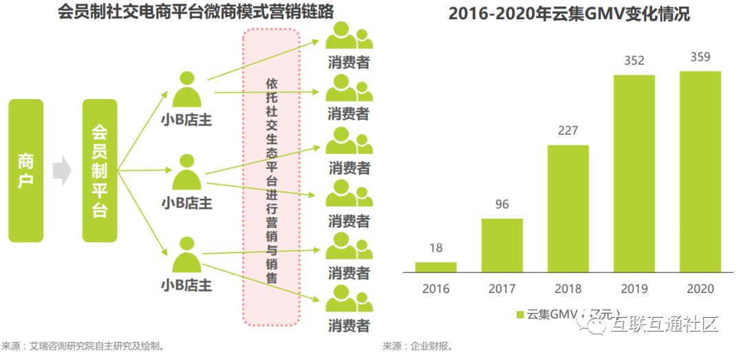 云集作为会员制社交电商,其通过S2B2C的模式实现商户和消费者之间的链接和交易促成。具体来讲,云集通过系列服务培养出小B店主,再通过吸引更多的消费者通过会员费或完成任务等方式成为会员,进而利用社交关系实现商品的分销。而在小B店主到消费者的分销过程中,往往是借助社交生态平台展开关系沉淀和信息交互,也是一种微商模式。过去几年 云集GMV的增长较为显著,但是2020年和去年基本持平,未来基于会员制的微商模式如何突破增长困境,也是行业共同 关注的问题。