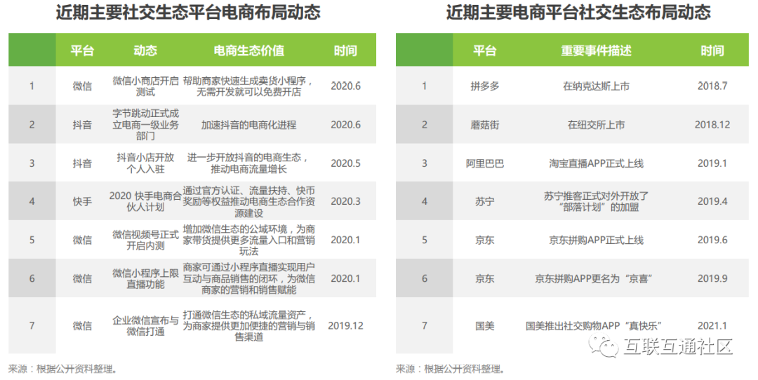 平台方:不断尝试和探索基于社交的功能与产品 社交互联网生态发展愈加成熟,电商、社交等平台在分销模式和带货场景上的布局和玩法不断丰富与创新。一方面,社交生态平台通过不断推出更多的功能支持和政策扶持,深化自身在电商生态布局;另一方面,电商平台也尝试通过推出独立产品等方式,增加自身的社交属性。在各大平台方的竞争之下,微商模式已经有了比较成熟的生长环境。尤其是依托各类社交生态平台和电商平台成长起来的微商市场服务商不断发展,也进一步反哺平台进行赋能,推动平台的微商布局建设。