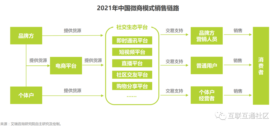 微商模式下的销售链路主要分为三个部分。从上游来看,主要由大型品牌方、个体户、电商平台等提供货源,其中大型品牌方和个体户既可直接与社交生态平台合作,也可通过电商平台和社交生态平台进行链接。从中游来看,主要由以即时通讯、短视频、直播、社区交友、购物分享等平台为代表的社交生态平台对上下游进行链接,一方面为货源方提供流量支持, 一方面为消费者提供更加便利的社交消费渠道。而在下游还有大量的微商从业人员,包括大型品牌方营销人员、普通用户、 个体户经营者等,基于社交生态平台对消费信息进行分发传播,进一步扩大消费的流动和裂变。