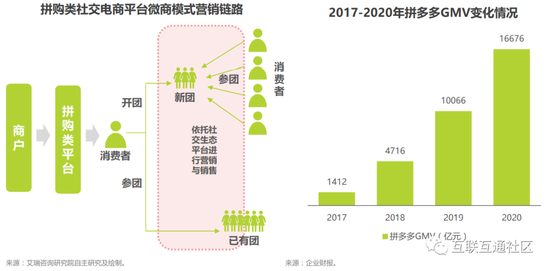 拼多多作为拼购类社交电商平台,其在营销链路上会通过聚集2人及以上得用户,以社交分享的方式进行组团,进而以更低的价格完成商品购买。而拼团的过程则大大加大了商品及相关营销信息在消费者之间的裂变和传播,进而帮助商户带来更多的销售机会。而从单个消费者到完成组团的过程,通常是基于社交生态平台的分发和传播,形成独特的微商模式。自成立以来,拼多多的GMV增长非常迅速,2020年全年GMV已经达16676亿元。