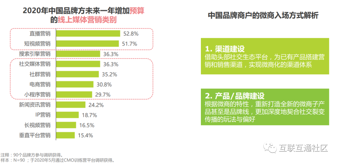 品牌方:更加重视社交渠道,用不同方式入场微商 社交渠道的销售和营销价值已经受到各行业的品牌方共同认可,根据艾瑞调研数据显示,2020年中国品牌主在线上媒体营 销预算增加的主要类别上,基本都是围绕直播、短视频、社群、小程序等社交生态关键词展开。而在此背景下,选择适合 的方式入场微商,成为品牌方当下的主要需求和痛点。通常来看,借助头部社交生态平台搭建营销和销售渠道是第一步, 而也有越来越多的品牌方会选择结合微商的特性,重新打造全新的微商子产品甚至是品牌线。