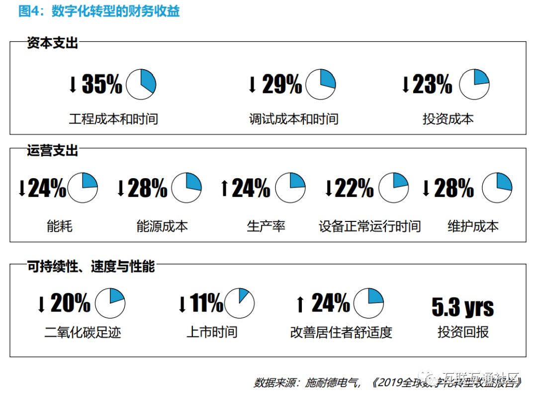 尽管数字化转型投资金额巨大,但调查数字化转型仍存在明显投资回报。世界经济论坛 (World Economic Forum)通过对1.6万家企业数据进行分析发现,数字化转型的领军 企业生产率提高了70%,而跟随者生产率提升了30%。这意味着数字化转型领军存在着 明显的先发制人的优势。
