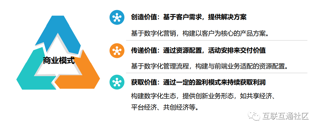 企业的商业模式是满足客户需求、实现相关方(客户、员工、合作伙伴、股东等)价值,同 时使系统达成持续盈利目标的整体解决方案。企业的商业模式主要由创造价值、传递价值和获取价值三个组成部分构成。数字化转型通过重塑这三方面来帮助企业实现商业模式创新。