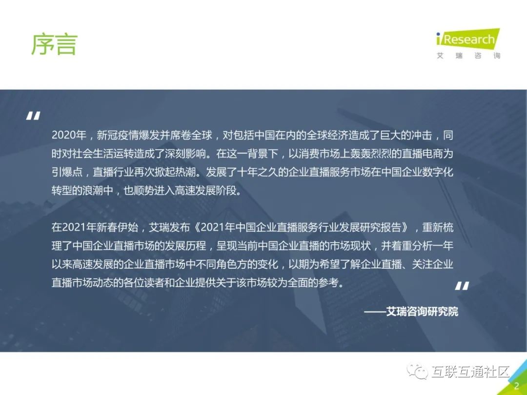 在2021年新春伊始,艾瑞发布《2021年中国企业直播服务行业发展研究报告》,重新梳 理了中国企业直播市场的发展历程,呈现当前中国企业直播的市场现状,并着重分析一年 以来高速发展的企业直播市场中不同角色方的变化,以期为希望了解企业直播、关注企业 直播市场动态的各位读者和企业提供关于该市场较为全面的参考。
