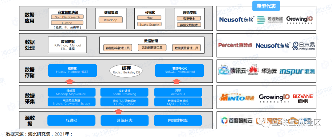 数据资产化的技术架构分为五个层级,底层是源数据,主要有互联网数据、系统日志数据和内部数据库;第二层则是数据采集环节,主要针对三大源数据有不同采集技术;第三层是存储环节,包括结构化数据存储和非结构化数据存储技术;第四层则是数据处理技术,主要有数据挖掘技术和 数据治理技术构成;第五层则是数据应用技术,包括商业智能分析、数据集成、可视化、营销变现等相关技术。