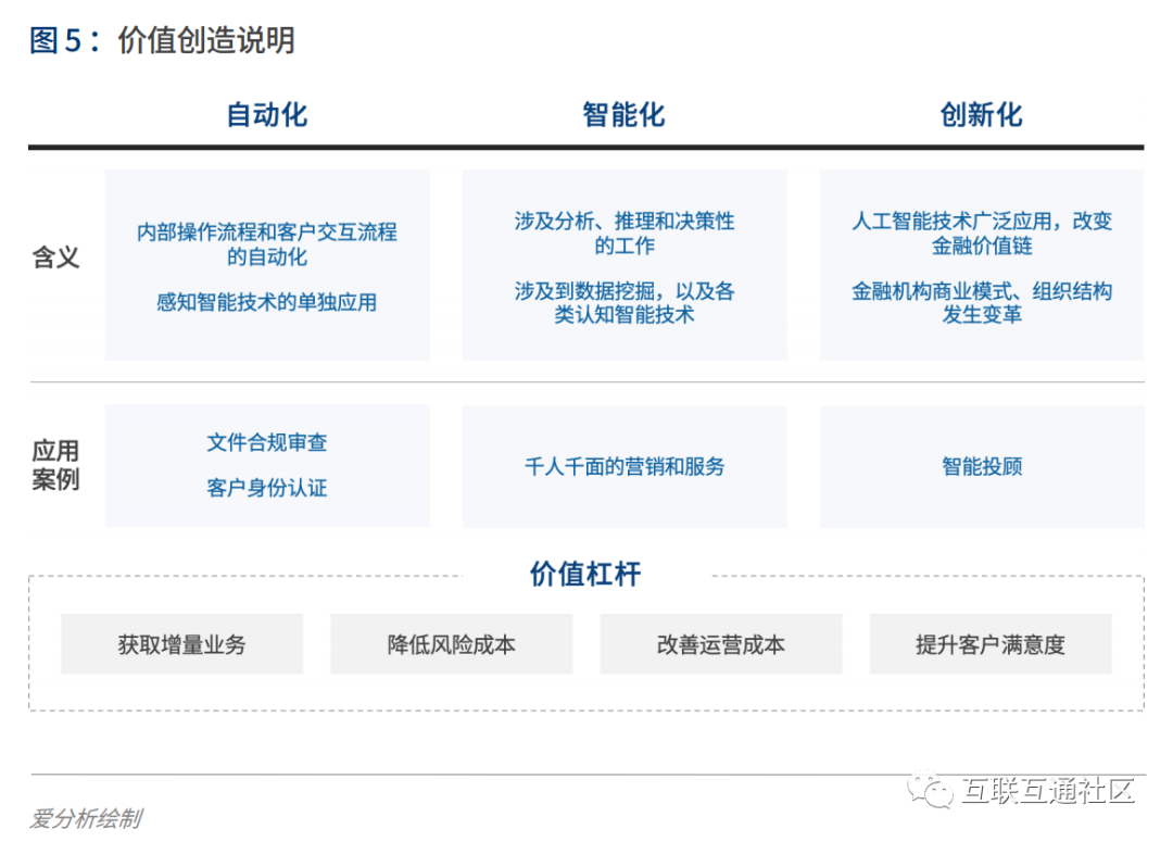 我们将人工智能技术为金融行业创造的价值分为三个层次:自动化、智能化、创新化。