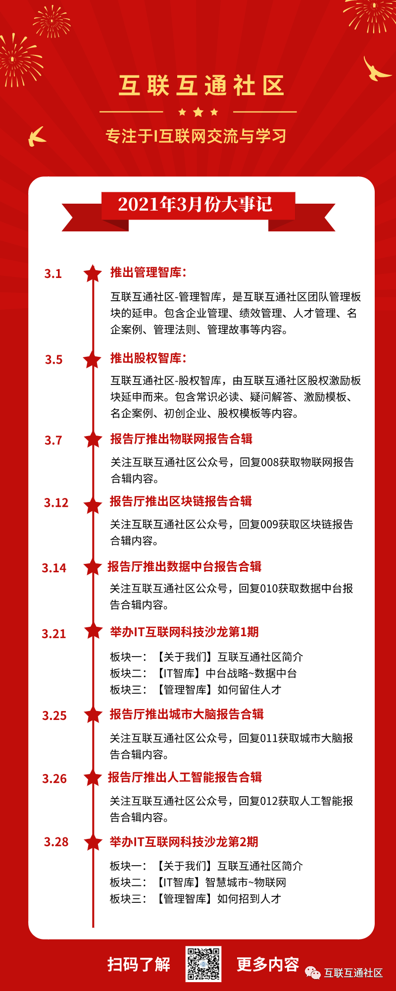 2021年3月1日互联互通社区推出管理智库:互联互通社区-管理智库,是互联互通社区团队管理板块的延申。包含企业管理、绩效管理、人才管理、名企案例、管理法则、管理故事等内容。