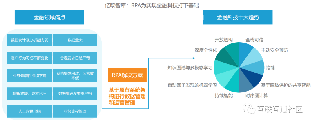◆ 与蚂蚁集团发布的2021年十大金融科技趋势相比,RPA的角色与价值更为基础,可基于原有系统架构进行数据管理和运营管理,在对现有系统的干扰降至最小的情况下,为金融科技技术的落地提供执行载体和可能性。