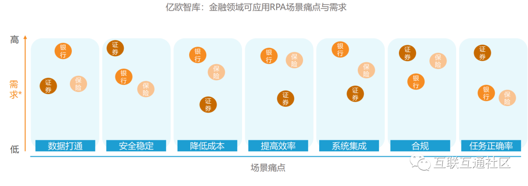 ◆ 在金融领域中,RPA普及率前三的分别是银行、证券、保险。这些细分领域均存在业务流程繁琐、流程系统自动化不足、业务监控 不全面、数据统计及分析能力弱,以及人工容易出错等转型痛点,但在RPA项目具体实施中,其需求侧重点和程度也有较大差异。