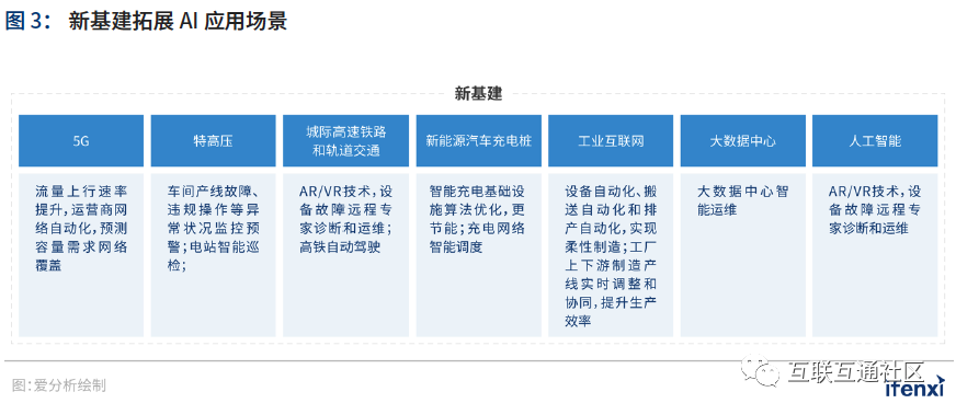 新基建区别于传统基建的核心在于数字化、智能化的属性,人工智能将在新基建的智能化建设中发挥关键作用,拓展应用场景。新基建涉及到的5G、特高压、城际高速铁路和轨道交通、新能源汽车充电桩、工业互联网、大数据中心等领域,都存在大量可利用AI改进业务流程、提升效率的场景。